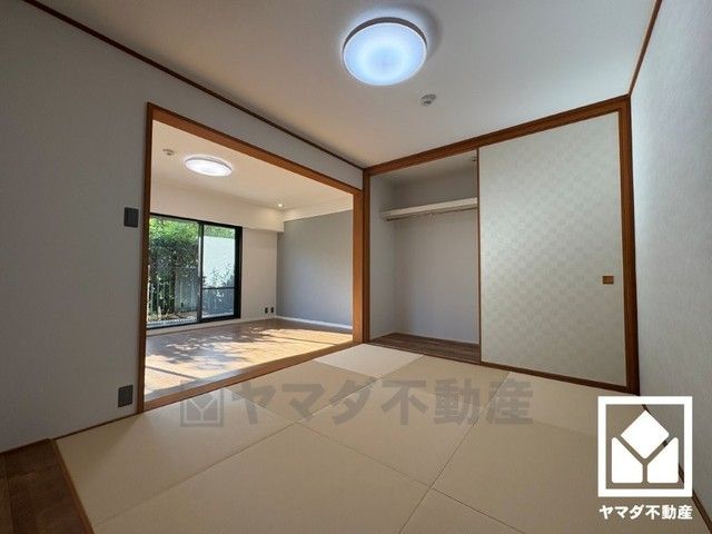 和室は約5.75帖。約15.7帖のリビングに隣接しており、一体利用も可能です。ゆとりのある押入れには、ご家族の季節の衣類などを収納して頂けます。