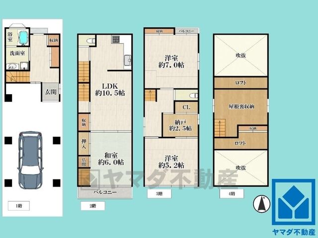 LDK10.5畳(2F)、和6畳(2F)、洋7畳(3F)、洋5.2畳(3F)、その他2.5畳(3F) |