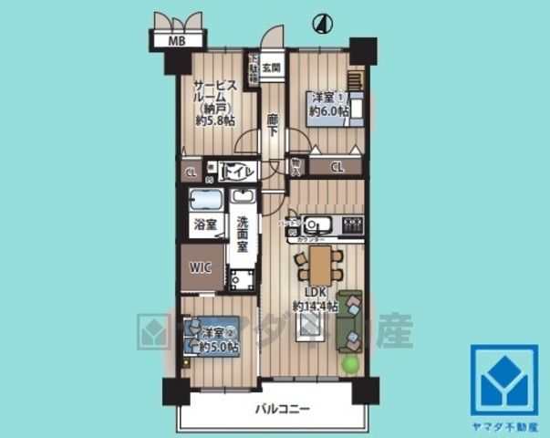 南向きバルコニーで陽当たり、風通し良好。