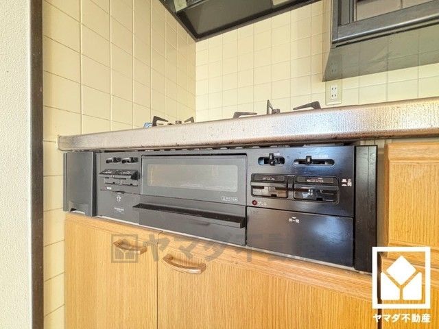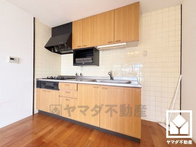 キッチンは空間を有効活用できる壁付けタイプ。毎日の料理がもっとスムーズになる、便利な3口コンロ仕様。
