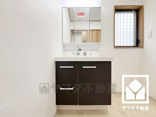 収納付きでスッキリお使い頂ける3面鏡の洗面台です。洗面ボウルが広めなので、忙しい朝でも身支度がしやすく時短になります。