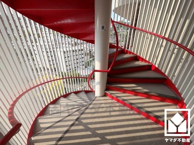 ホワイト×レッドのスタイリッシュな外階段がマンションを美しく彩ります。柵が上部まで繋がっており隙間が小さいため落下の危険がなく、デザインと安全性を両立した作りになっています。