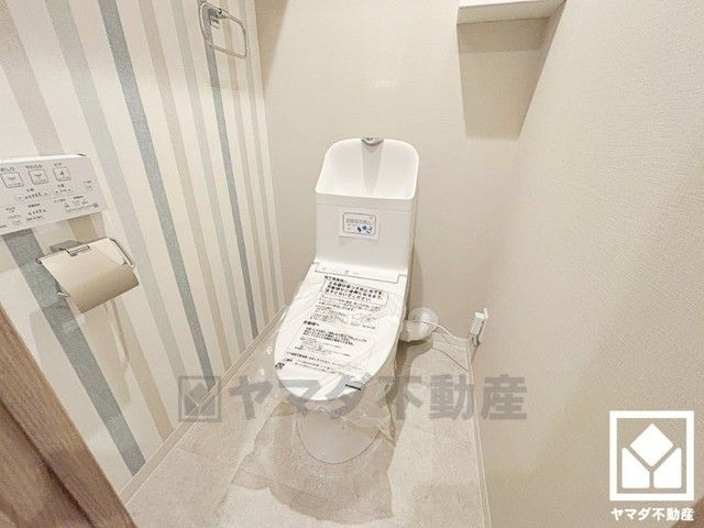 明るく清潔感溢れるトイレです。トイレットペーパーのストックや消耗品置き場、小物置きなどとしてもお使いいただける棚がございます。