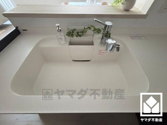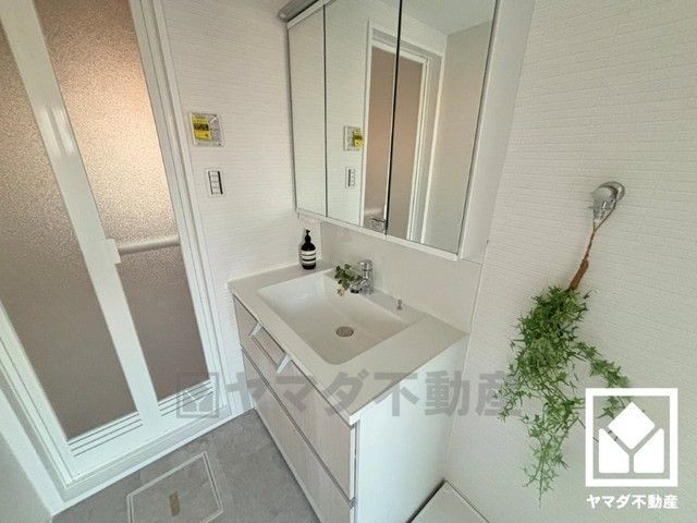 収納付きでスッキリお使い頂ける3面鏡の洗面台です。広々カウンターで、忙しい朝でも身支度がしやすく時短になります。