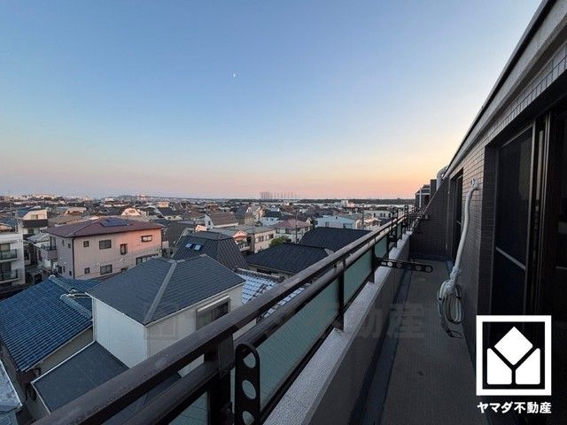 5階建て最上階につき眺望良好です。前面に視界を遮る高い建物がなく、開放的な景色が広がります。バルコニーから南西方向には海が見えます。