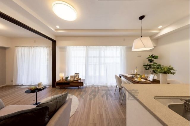 リビングは約12.8帖。約5.0帖の洋室が隣接しており、一体利用も可能です。