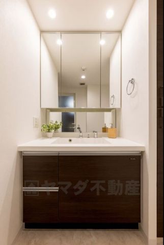 収納付きでスッキリお使い頂ける3面鏡の洗面台です。カウンターが広めなので、忙しい朝でも身支度がしやすく時短になります。