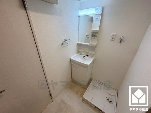 収納付きでスッキリお使い頂ける洗面台です。洗面ボウルが広めなので、忙しい朝でも身支度がしやすく時短になります。