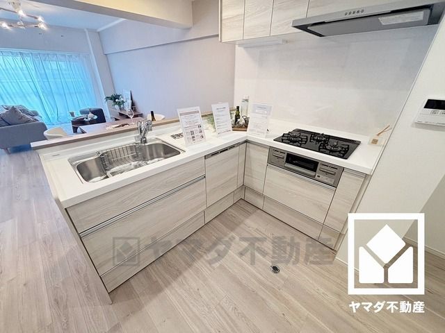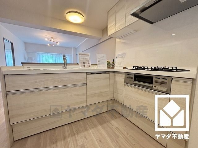 対面式キッチンなのでお料理中でもお子様の様子が分かって安心です。L型なので作業動線が最短距離で効率良く動けます。コーナー部分の作業スペースをより広く確保できているのも魅力です。