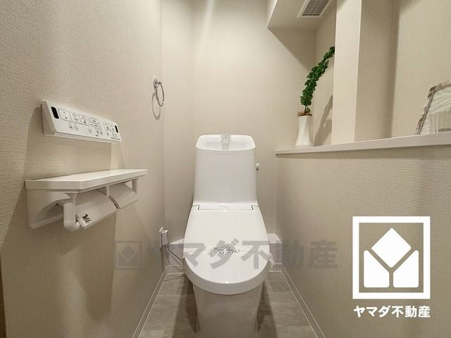 明るく清潔感溢れるトイレです。2連トイレットペーパーホルダーなのでお取替えの手間が軽減できます。