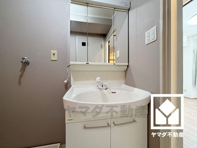 収納付きでスッキリお使い頂ける3面鏡の洗面台です。洗面ボウルが広めなので、忙しい朝でも身支度がしやすく時短になります。