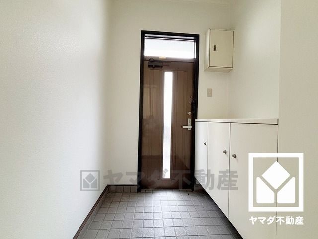 白を基調とした明るい玄関です。シューズボックス付きで、家族の靴もしっかり収納。玄関がいつも片付き、気持ちよくお客様を迎えられます。