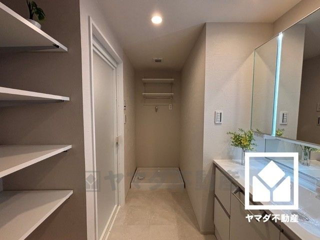 室内洗濯機置場がございますので、天候に左右されず洗濯していただけます。上部に棚があるので消耗品などをスッキリ置けるのも嬉しいポイント。バスタオルやパジャマ等を収納できるリネン庫もございます。