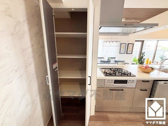 キッチン横にはパントリーがございます。まとめ買いしても心配要らずの収納力です。