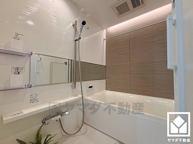 清潔感あふれる空間で、毎日のバスタイムをより快適に。鏡が横長なので、お子様でも見やすく便利です。