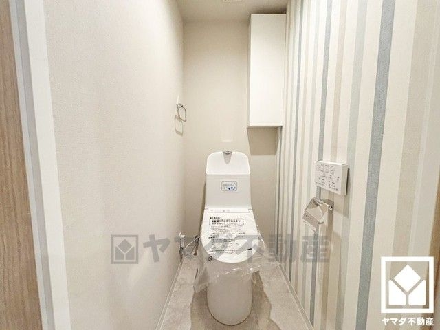 明るく清潔感溢れるトイレです。トイレットペーパーのストックや、消耗品置き場などとしてお使いいただける吊戸棚がございます。