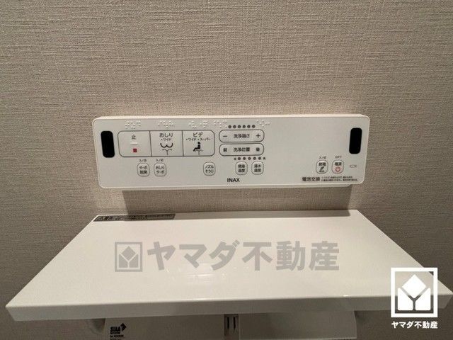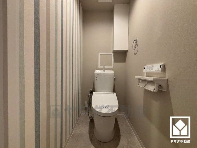明るく清潔感溢れるトイレです。2連トイレットペーパーホルダーなのでお取替えの手間が軽減できます。トイレットペーパーのストックや、消耗品置き場などとしてお使いいただける吊戸棚もございます。