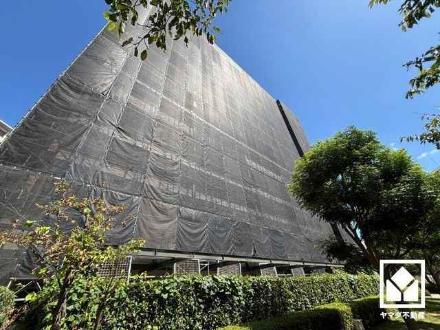陽光に映える美しい外観。街並みに馴染みながらも、ひときわ目を引く存在感。現在大規模修繕工事中です。
