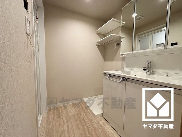収納付きでスッキリお使い頂ける3面鏡の洗面台です。洗面ボウルが広めなので、忙しい朝でも身支度がしやすく時短になります。