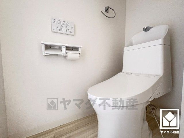 明るく清潔感溢れるトイレです。2連トイレットペーパーホルダーなのでお取替えの手間が軽減できます。