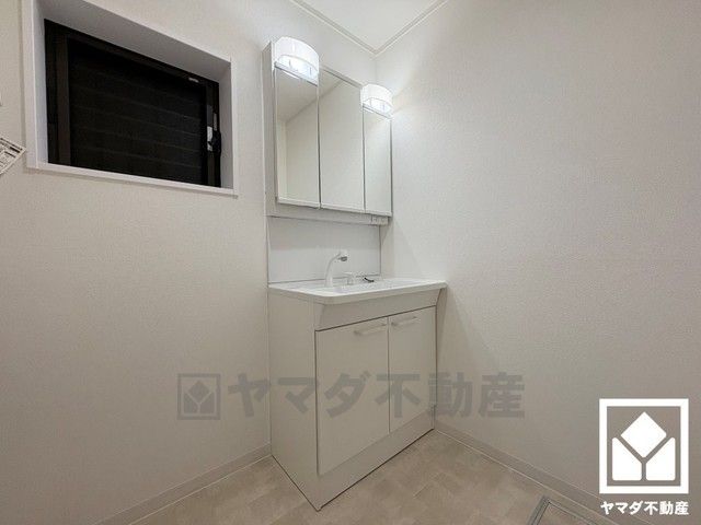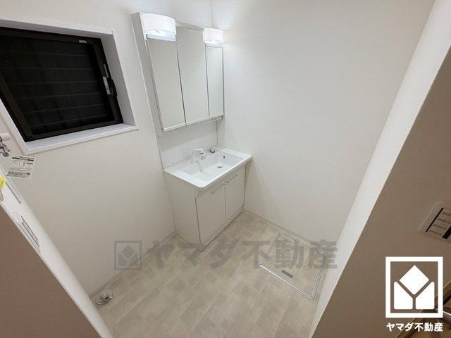 収納付きでスッキリお使い頂ける3面鏡の洗面台です。洗面ボウルが広めなので、忙しい朝でも身支度がしやすく時短になります。