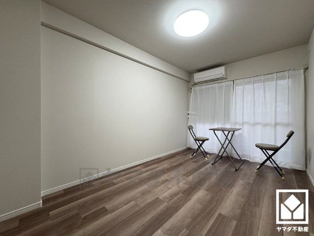 約5.6帖の洋室です。バルコニーにつながるお部屋で、通風・陽当たり良好。新品エアコン設置済みのお部屋となっております。