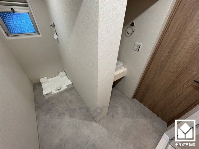 シンプルで美しい、どんなインテリアにもマッチする洗面台です。室内洗濯機置場がございますので、天候に左右されず洗濯していただけます。