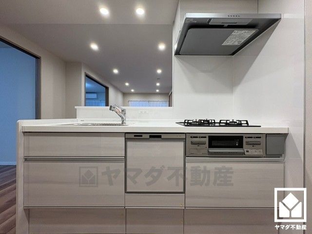 キッチンはカウンター付きの対面式。配膳や片付けがしやすく、お料理中でもお子様の様子が分かって安心です。毎日の料理がもっとスムーズになる、便利な3口コンロ付き。