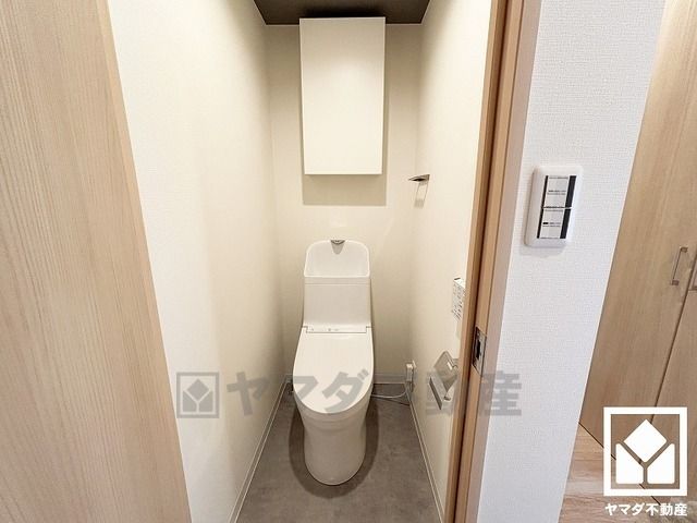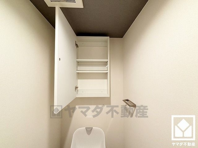 トイレットペーパーのストックや消耗品置き場などとしてお使いいただける吊戸棚がございます。