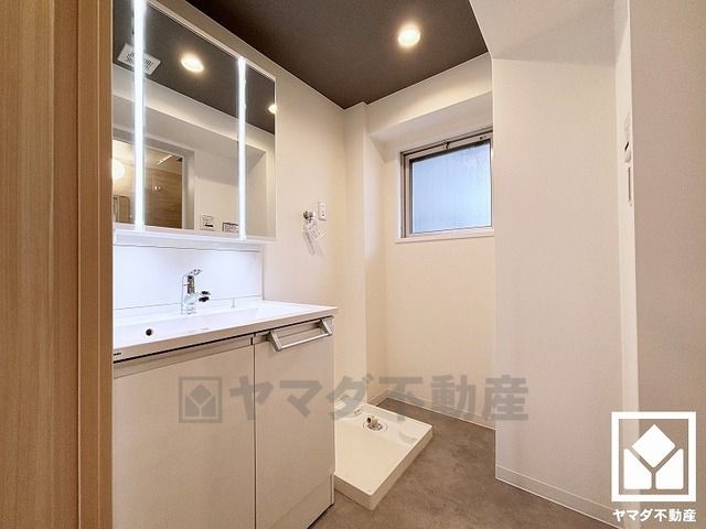 3面鏡の洗面台です。縦に2本配置されたLED照明が顔全体を明るく均等に照らしてくれるので、スキンケアやメイクがしやすくなります。