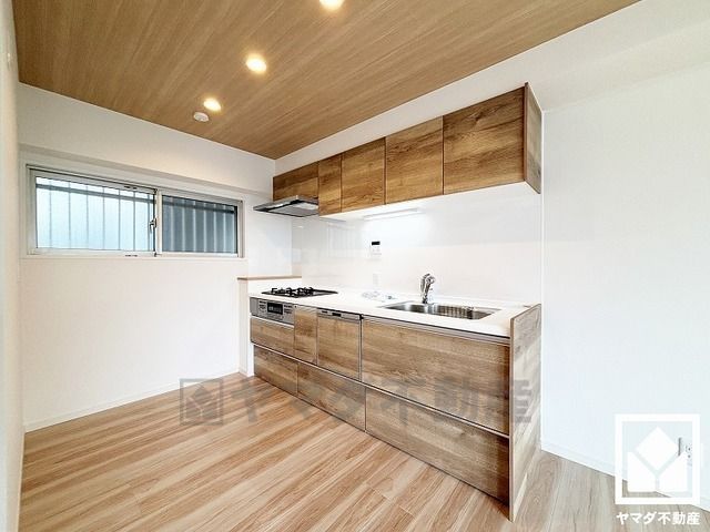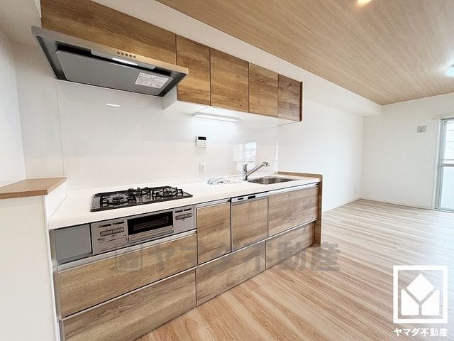使いやすさとデザイン性を両立。落ち着いた木目調のデザインが魅力のシステムキッチンです。壁付けタイプで空間を有効活用。