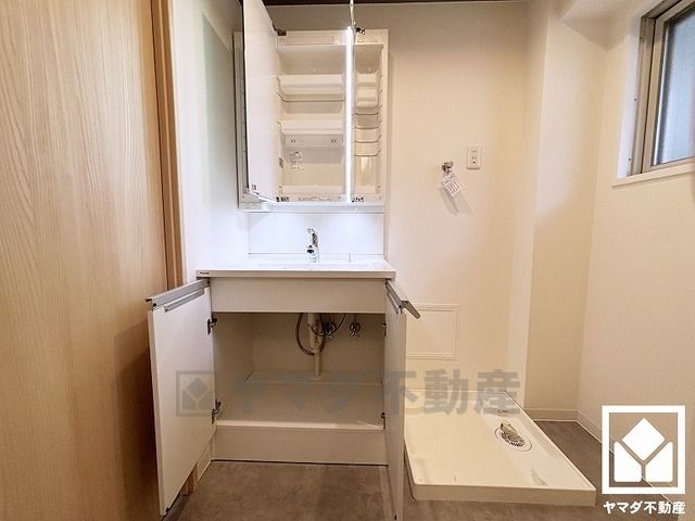 洗面台は鏡の後ろにも収納スペースがありオーラルケア・ヘアケア・スキンケア用品などもスッキリ片付くので、忙しい朝でも身支度がしやすく時短になります。