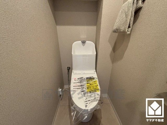 明るく清潔感溢れるトイレです。トイレットペーパーのストックや消耗品置き場などとしてお使いいただける吊戸棚がございます。