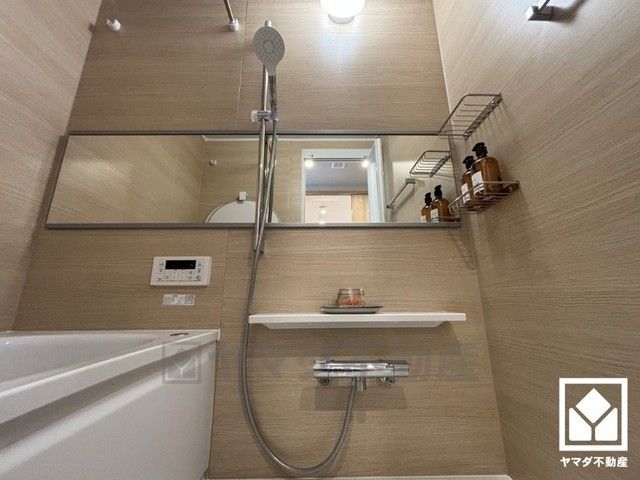 1日の疲れを癒す浴室でゆったりリフレッシュ。ナチュラルな木目調のパネルは落ち着いた雰囲気を演出してくれます。鏡が横長なので、お子様でも見やすく便利です。