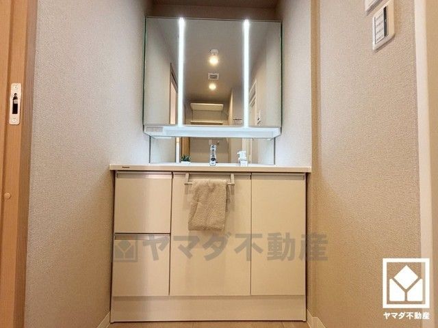収納付きでスッキリお使い頂ける3面鏡の洗面台です。縦に2本配置されたLED照明が顔全体を明るく均等に照らしてくれるので、スキンケアやメイクがしやすくなります。