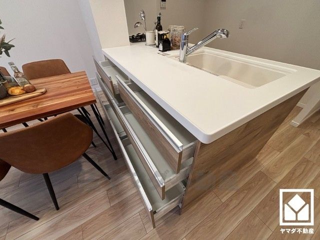 キッチンには前面収納もございます。食器やカトラリー、お子様の文房具までスッキリ片付きます。ダイニングへの動線が短いので家族が取り出しやすく、配膳や片付けもしやすくなります。