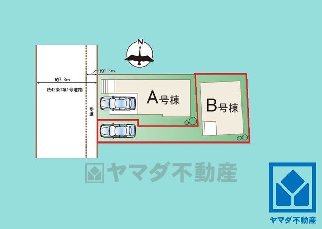 前面道路幅員約7.8m(歩道約1.5m)とゆったりとした広さがあるのでファミリーカー等の車の出入れも楽にできます。