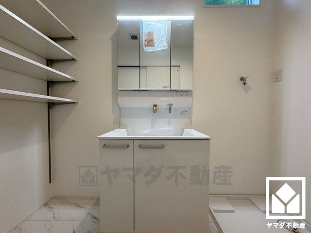 収納付きでスッキリお使い頂ける3面鏡の洗面台です。洗面ボウルが広めなので、忙しい朝でも身支度がしやすく時短になります。