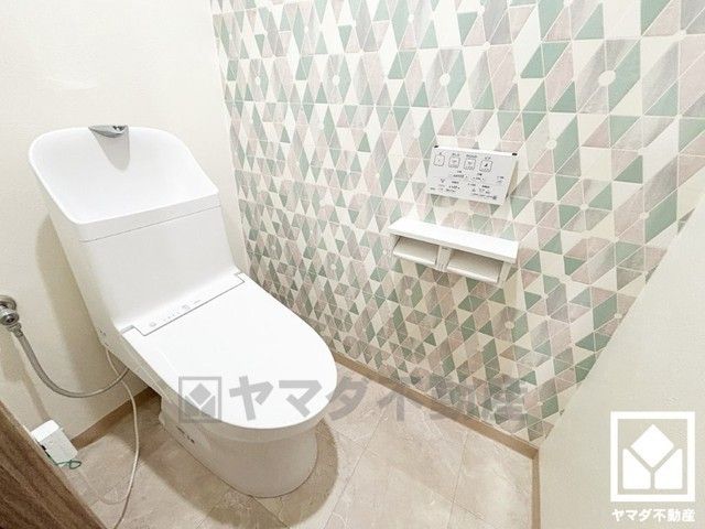 遊び心のあるアクセントパネルが魅力的なトイレです。2連トイレットペーパーホルダーなのでお取替えの手間が軽減できます。