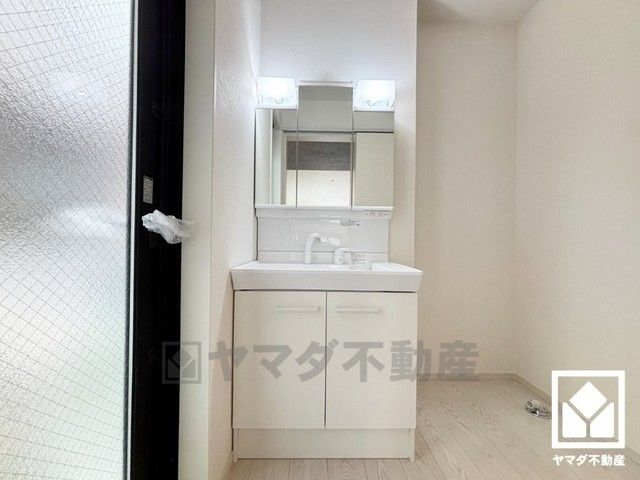 収納豊富でスッキリお使い頂ける3面鏡の洗面台です。洗面ボウルが広めなので、忙しい朝でも身支度がしやすく時短になります。