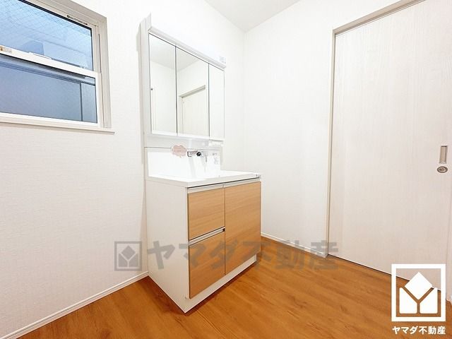 収納付きでスッキリお使い頂ける3面鏡の洗面台です。洗面ボウルが広めなので、忙しい朝でも身支度がしやすく時短になります。