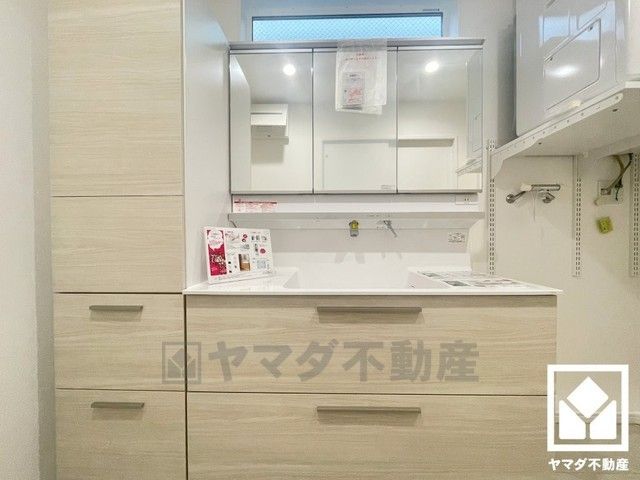収納豊富なトールキャビネット付きでスッキリお使い頂ける3面鏡の洗面台です。カウンターが広めなので、忙しい朝でも身支度がしやすく時短になります。