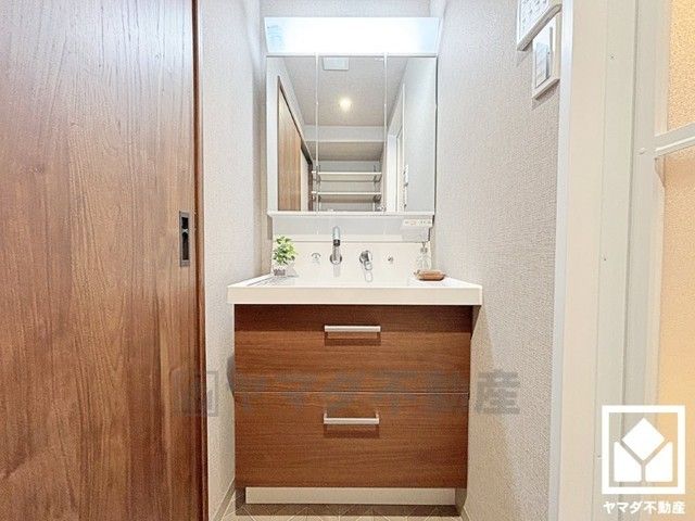収納付きでスッキリお使い頂ける3面鏡の洗面台です。洗面ボウルが広めなので、忙しい朝でも身支度がしやすく時短になります。