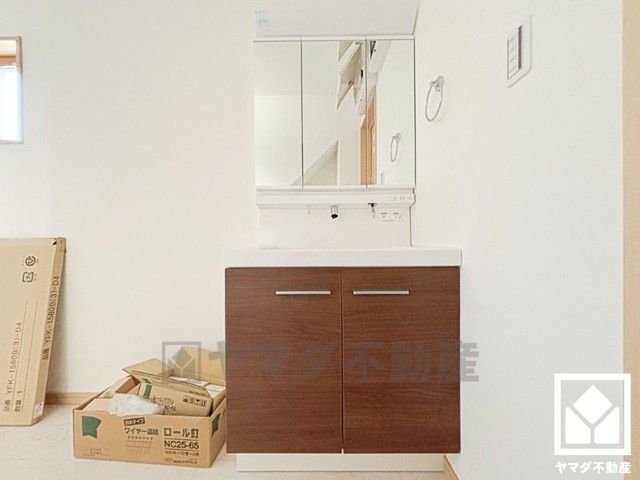 収納付きでスッキリお使い頂ける3面鏡の洗面台です。洗面ボウルが広めなので、忙しい朝でも身支度がしやすく時短になります。