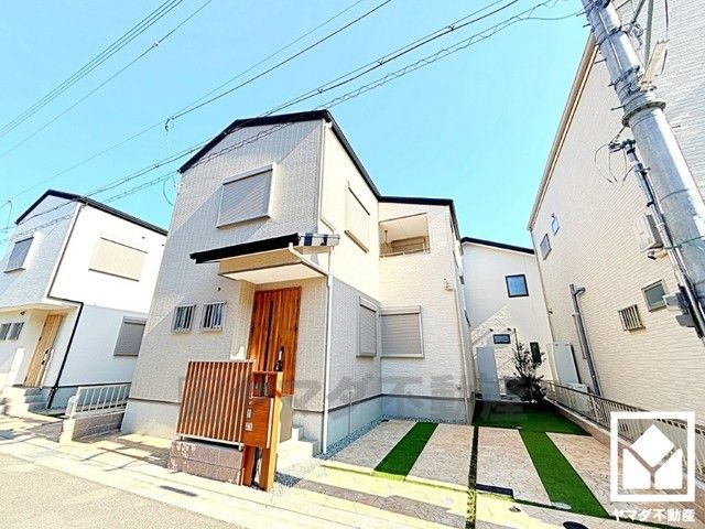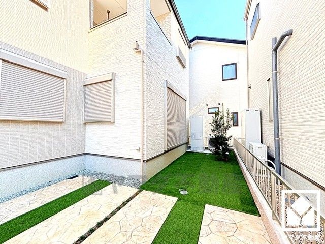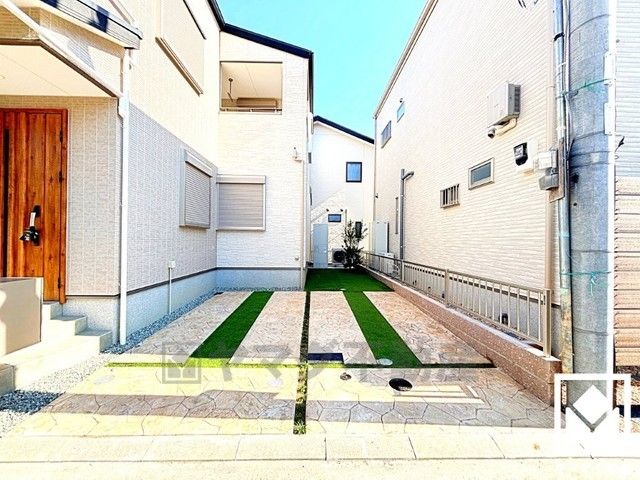 駐車スペースを普通車並列2台分確保。重い荷物や雨の日の移動もスムーズで、快適なカーライフを実現。来客時にも便利です。奥はガーデニングやお子様のプール・遊び場にもなる人工芝付きのお庭になっています。