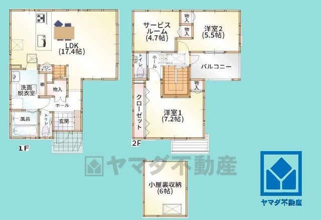 たっぷり収納できる約4.7帖のサービスルーム付きだから、家の中をもっとスッキリ。季節の荷物や趣味の道具もしっかり収納。