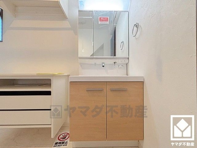 収納付きでスッキリお使い頂ける3面鏡の洗面台です。洗面ボウルが広めなので、忙しい朝でも身支度がしやすく時短になります。
