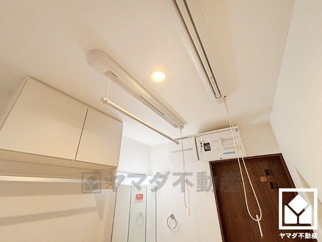 洗面台の隣にはキャビネットが設置されています。生活感の出やすい小物を隠して収納できるので、洗面室がスタイリッシュで清潔感のある印象になります。