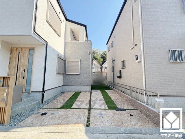 駐車スペースを普通車並列2台分確保。重い荷物や雨の日の移動もスムーズで、快適なカーライフを実現。来客時にも便利です。奥はガーデニングやお子様のプール・遊び場にもなる人工芝付きのお庭になっています。