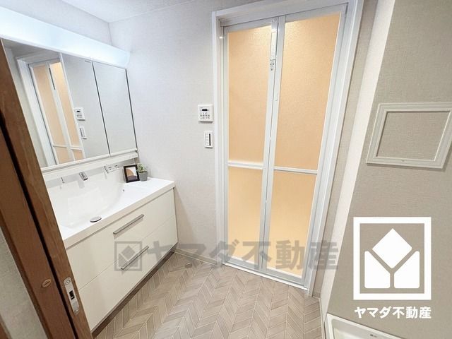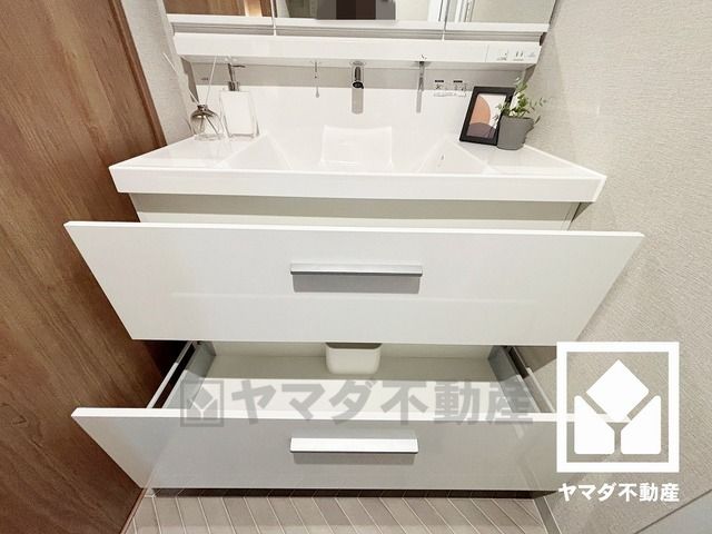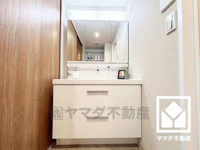 3面鏡の洗面台です。洗面ボウルが広めなので、忙しい朝でも身支度がしやすく時短になります。